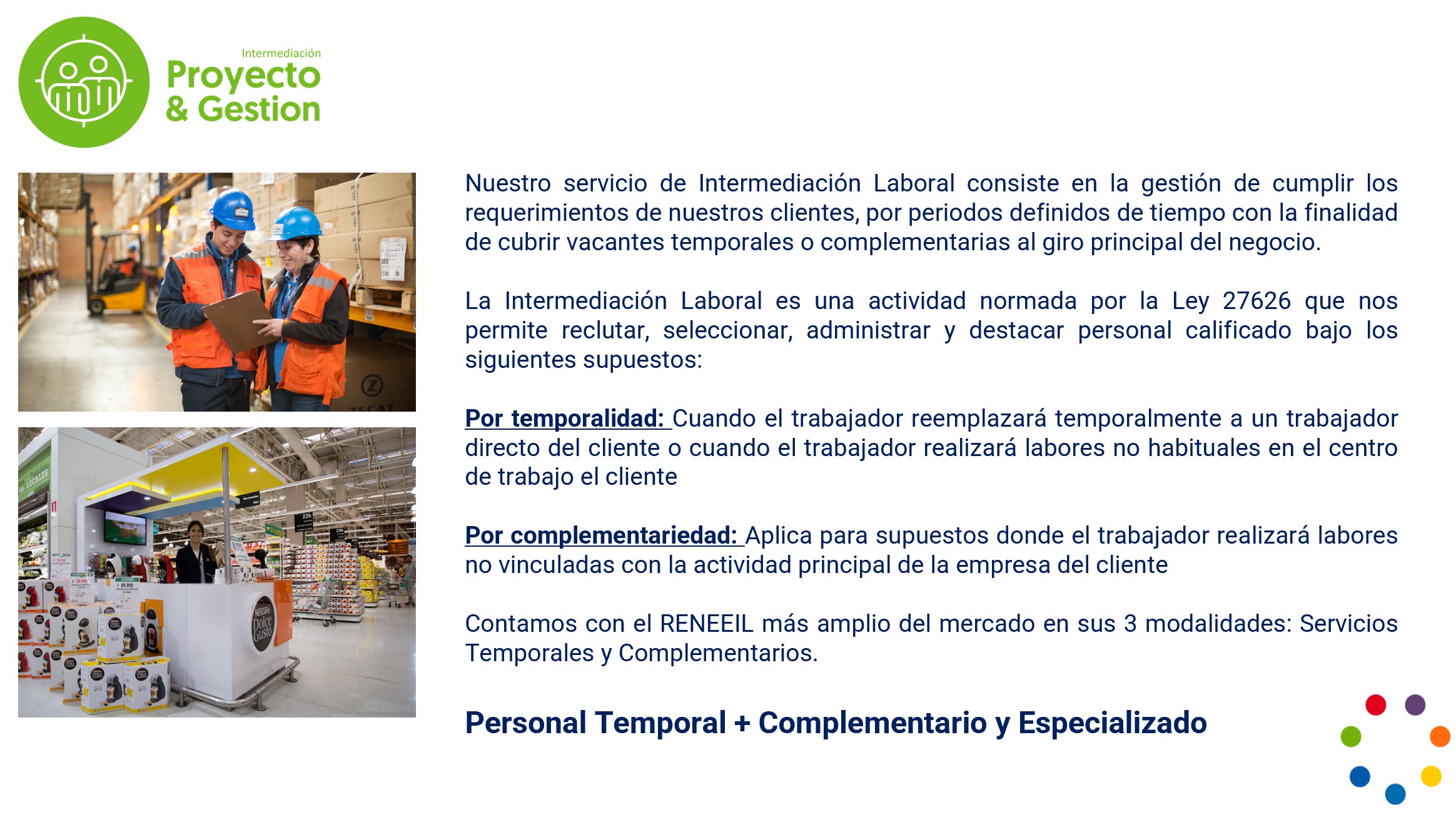 Somos la Empresa de Intermediación laboral con el Reneeil más completo del mercado, te ayudamos a analizar y viabilizar este tipo de servicio de la mano con el cumplimiento legal necesario para el mismo.